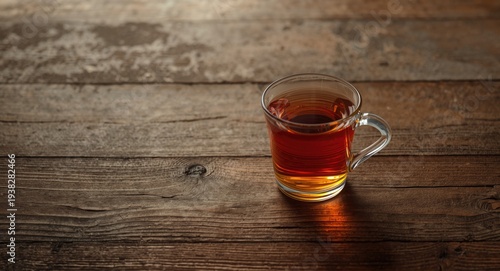 A cup of herbal tea placed on a weathered wooden table with subtle texture