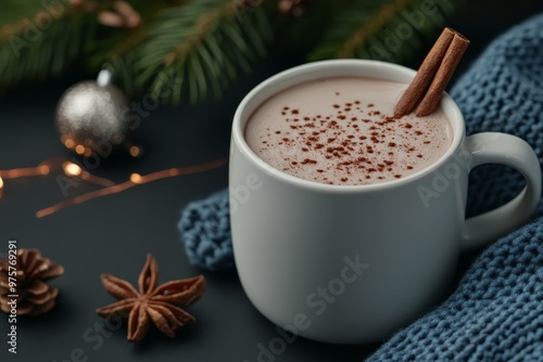 A cup of hot chocolate garnished with cinnamon sticks, surrounded by holiday decor, cozy textures, bringing warmth and a festive atmosphere.