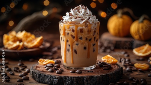 A cup of iced coffee with caramel and whipped cream, refreshing and delicious, warm lighting, cozy atmosphere, still life