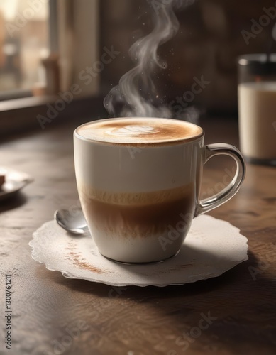 A cup of steaming hot coffee with a layer of frothed milk and espresso at the bottom, liquid, beverage, warm