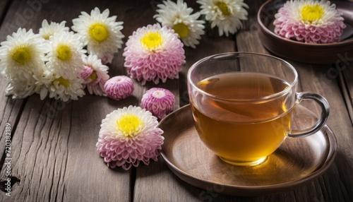 A cup of tea with flowers on a wooden table