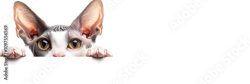 A curious cat peeking over a surface, showcasing its expressive eyes and playful demeanor.