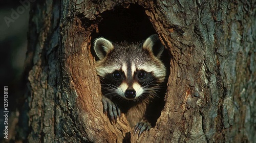 A curious raccoon peeks out from a hollow tree trunk, showcasing its distinctive facial markings and playful demeanor.