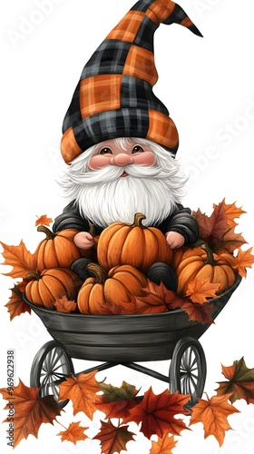 A cute, adorable gnome with white hair and a beard, wearing a black, grey, and orange plaid hat, sitting in a wheelbarrow full of pumpkins surrounded by autumn leaves