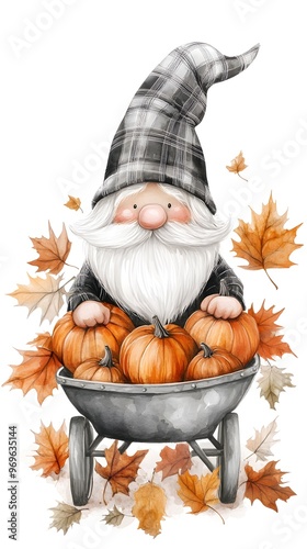 A cute, adorable gnome with white hair and a beard, wearing a black, grey, and orange plaid hat, sitting in a wheelbarrow full of pumpkins surrounded by autumn leaves
