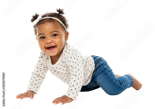 A cute african american baby girl is crawling and smiling on a transparent
