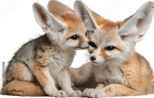 A cute baby fox cub and an adult fennec fox in love, transparent background