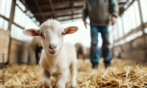 A cute baby goat stands curiously on straw in a barn, with a farmer standing behind it.