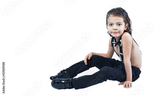 A cute boy in suspenders sits on the floor and looks into the camera. White background.