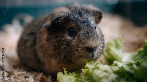 A cute brown and black guinea pig is happily eating fresh green lettuce in its cozy enclosure with soft bedding