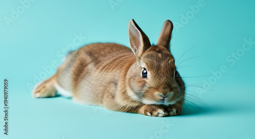 A cute brown rabbit lies on a blue surface looking directly at the camera.