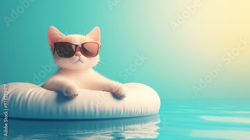 A cute cat wearing sunglasses and floating in a pool on an inflatable ring.