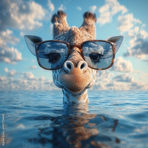 A Cute Giraffe Wearing Sunglasses Swimming Underwater, with the Reflection of the Sky and Clouds in Its Glasses, Against a Summer Sea Horizon Background in a Realistic Photographic Style