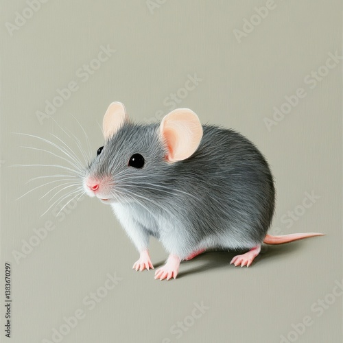 A cute, grey mouse stands on a smooth, light-colored surface.