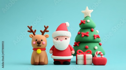 A cute, illustrative scene with clay-like figurines of Santa Claus and a reindeer standing next to a stylized Christmas tree and a small gift on a light blue background.