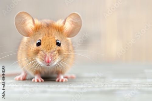 A cute, small brown mouse with large ears and bright eyes, sitting on a textured surface, showcasing its playful and curious nature.