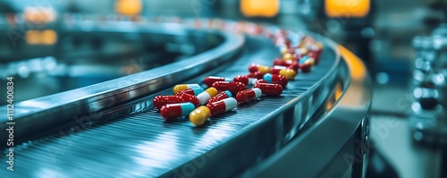 A cuttingedge pharmaceutical manufacturing plant with a sophisticated conveyor belt system, packaging pills and medications in a sterile environment