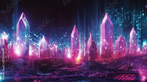 A cybernetic landscape with glowing circuit boards, holographic sound wave displays, and animated data charts in the background.