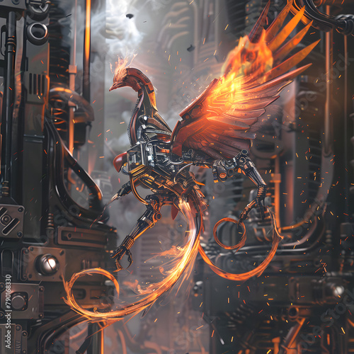 A cybernetic phoenix rising from the ashes of obsolescence, symbolizing the eternal renewal of technology and innovation.