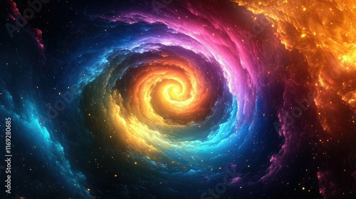 A D rendering of multicolored particles spiraling into a vortex, creating a dynamic and energetic scene with glowing elements that evoke movement and power