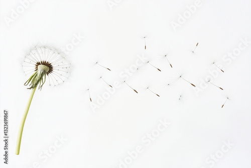 A dandelion with floating seeds on a white background symbolizes hope and comfort. It represents condolence, grief, loss, funerals, support, remembrance, and solace.