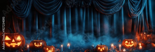 A dark and atmospheric Halloween backdrop with glowing jack-o-lanterns, a fog-filled forest, and a dramatic curtain.