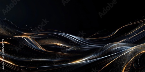 A dark black background with flowing golden and silver lines, weaving through an abstract digital landscape