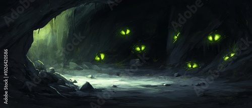 A dark cave with glowing eyes on the walls