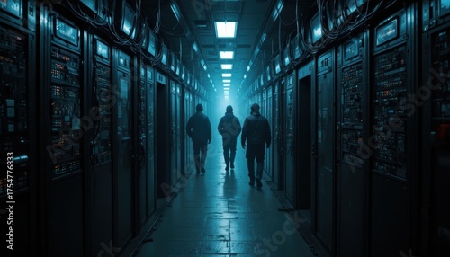 A dark corridor lined with server racks, featuring three silhouetted figures walking towards a dimly lit end, creating a mysterious atmosphere.