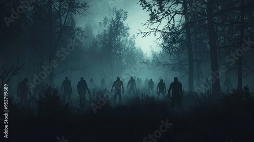 A dark, eerie background with shadows of zombies creeping through a foggy forest.