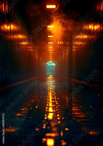 A dark hallway with a light shining down on it