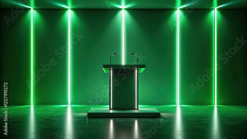 A darkened room with a lone podium stands empty under a soft glow of green neon lights, the only sound being the faint hum of the lighting system , background only, green neon lights