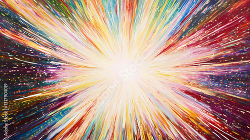 A dazzling burst of light streaks across the canvas, each line a vibrant spectrum of color, converging towards a brilliant white center. Dazzling Spectrum. Illustration