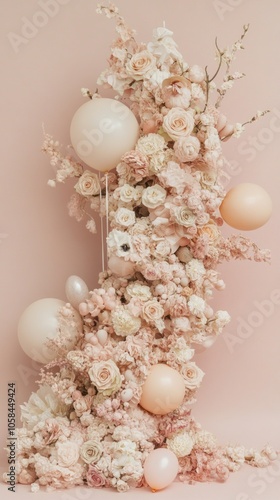 A decorative arrangement of pink flowers and balloons for events or celebrations.