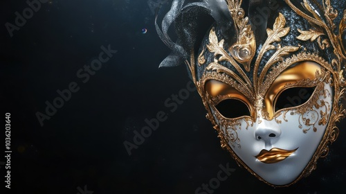 A decorative masquerade mask with gold accents and intricate designs against a dark background.