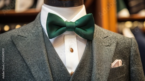 A deep green bow tie resting on a classic three-piece suit ensemble