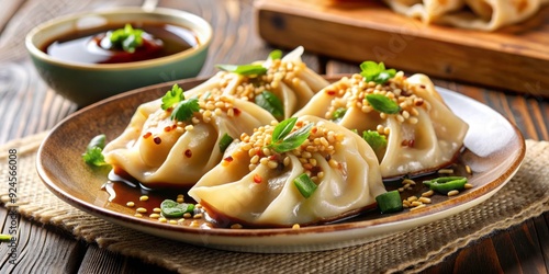 A delectable serving of Gyoza, a popular Chinese-Japanese dumpling delicacy, steamed to perfection, garnished with soy sauce and sesame oil, on a elegant hotel menu.