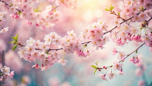 A delicate arrangement of cherry tree branches adorned with soft pink blossoms in a gentle springtime setting, showcasing the beauty of nature's fleeting season, botanical illustration, cherry blossom