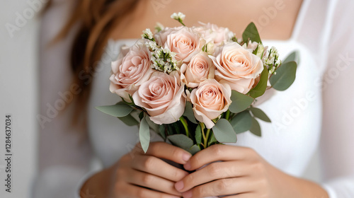 A delicate bouquet of soft pink roses held by a woman in a white dress, symbolizing love and elegance.