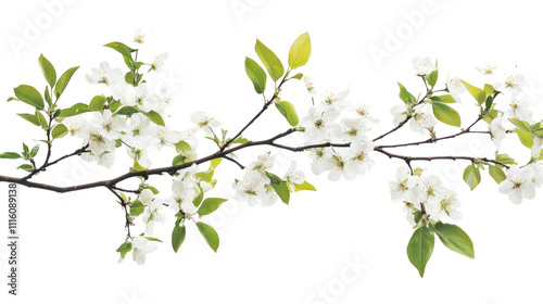 A delicate branch adorned with white blossoms and green leaves, symbolizing beauty and renewal in nature.