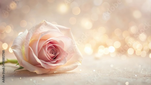 A Delicate Pink Rose Resting on a Sparkling Surface with a Soft, Festive Background
