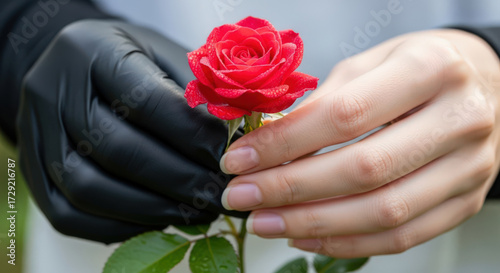 A Delicate Touch The Art of Handling Roses with Care and Precision A Close Up of Hands Holding a Vibrant Red Rose Symbolizing Beauty and Fragility in a Garden Setting