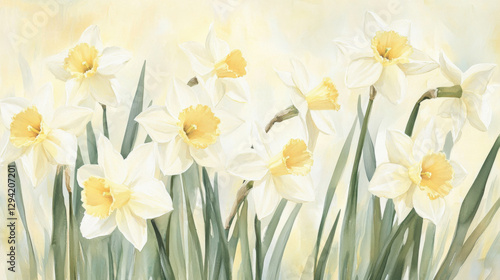 A delicate watercolor painting of sun-kissed daffodils in soft yellow and white hues, their slender green stems swaying gently