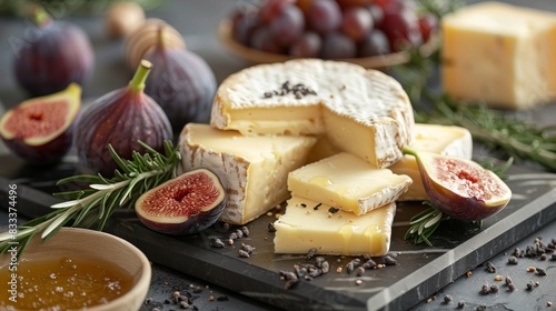 A delicious and healthy snack of cheese and fruit; brie cheese with figs, grapes, and honey.