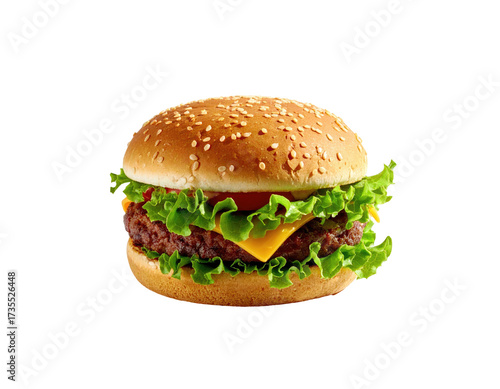 A delicious burger with a sesame seed bun, cheese, lettuce, tomato, and patty