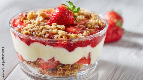 A delicious strawberry parfait layered with yogurt, fresh strawberries, and crunchy granola sits on a wooden table. The vibrant colors make it a tempting dessert perfect for any occasion.