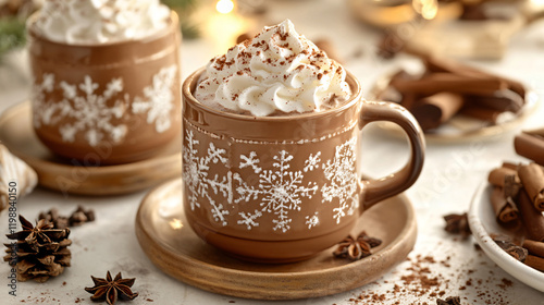 A delightful mug of hot chocolate, crowned with a cloud of whipped cream and a generous sprinkle of cocoa powder, perfect for cold weather enjoyment.