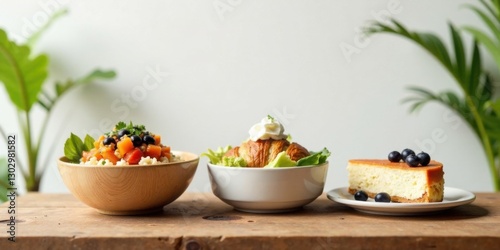 A delightful trio of culinary creations a vibrant grain bowl, a delicate croissant salad, and a creamy cheesecake slice, artfully arranged on a rustic wooden surface