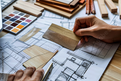 A designer focuses on sketches and material samples to create an innovative interior design for a contemporary environment