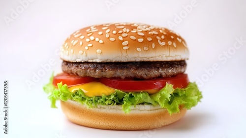 A detailed close-up of a delicious hamburger featuring fresh lettuce, juicy tomato, and melted cheese, showcasing vibrant colors and textures.